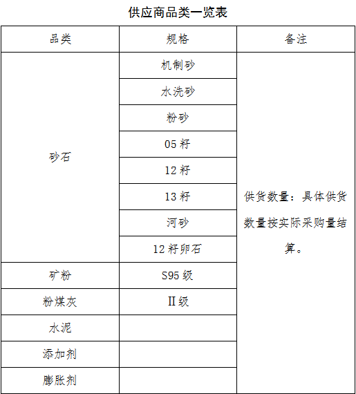 本次征集活动为2025年度第二次原材料供应商的征集,征集供应商品类为:砂石、水泥、粉煤灰、矿粉、膨胀剂、减水剂、外加剂等,现每年总需求约200万吨。